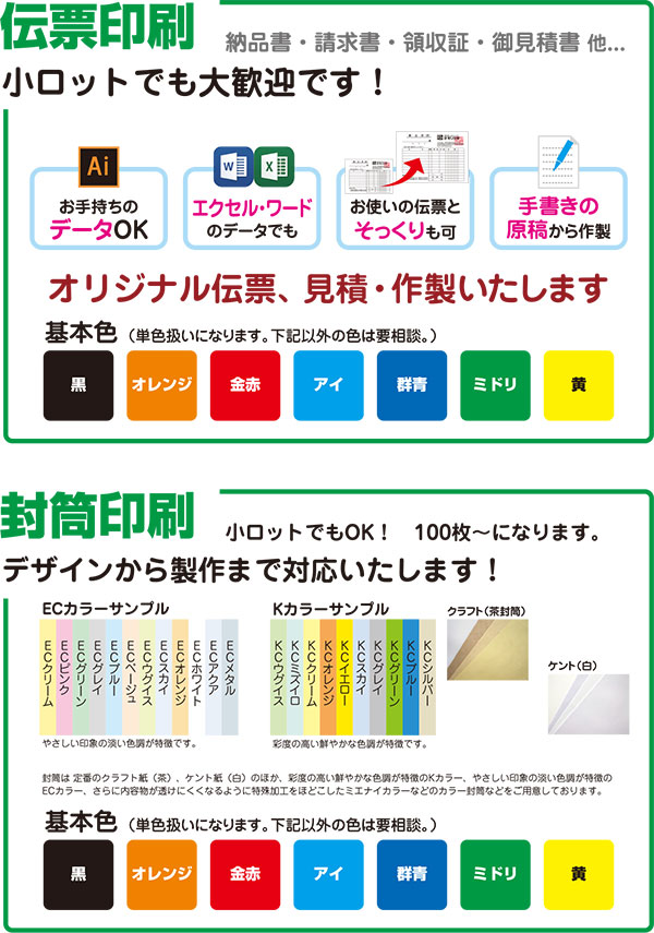 チラシ/会社案内/ハガキ/封筒/会報/カタログ/カレンダー/帳票類、シール/ポスターなど。小ロットから大量まで何でもお任せ下さい。